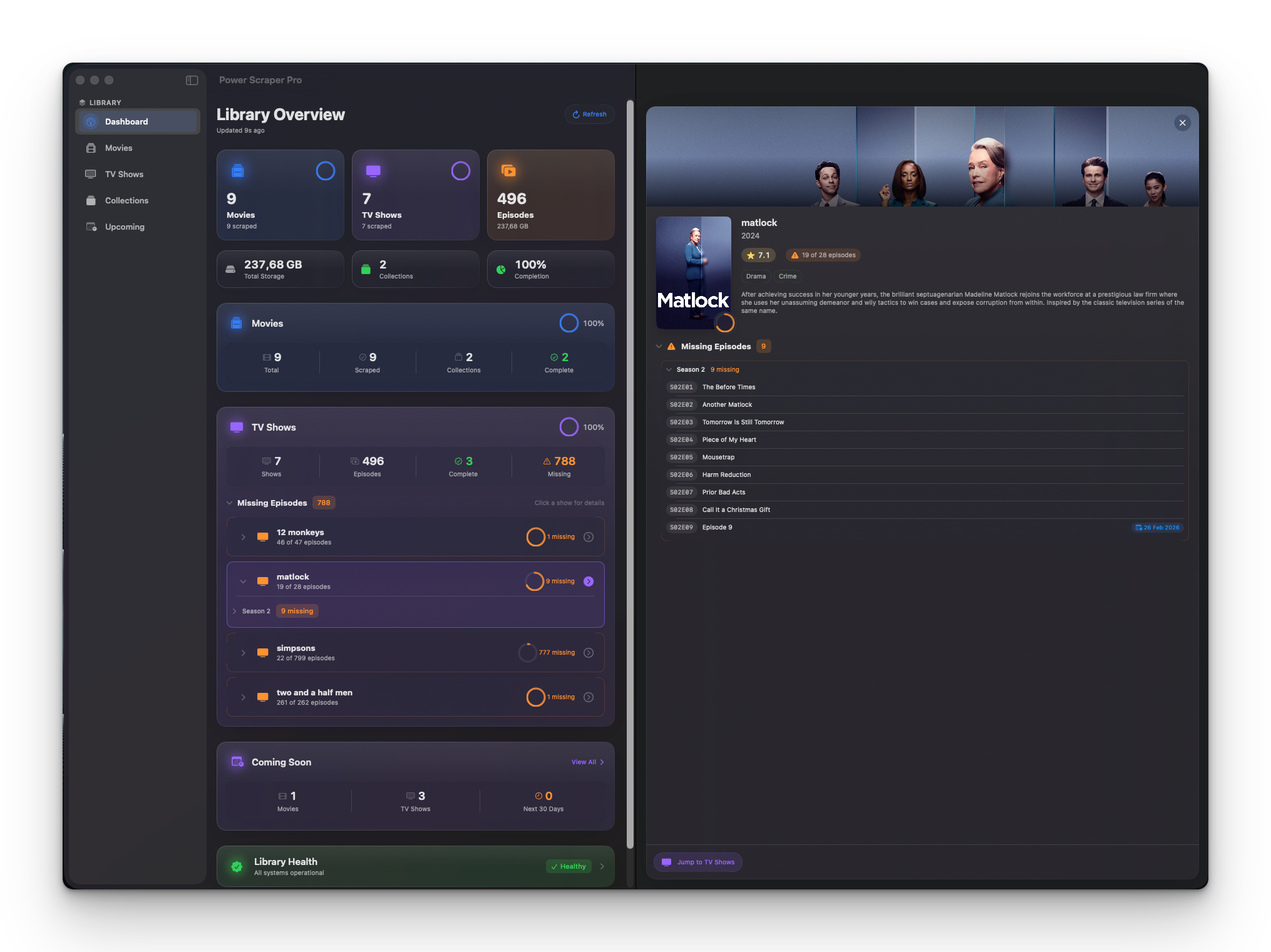 See everything at a glance - total movies, TV shows, episodes, storage used, library health score, missing episodes, and upcoming releases all in one beautiful dashboard.